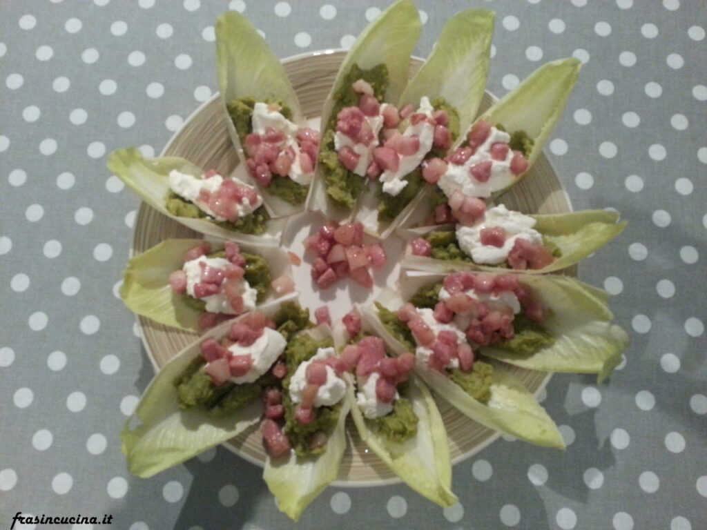 Fiore di indivia con crema di piselli ricotta e pancetta