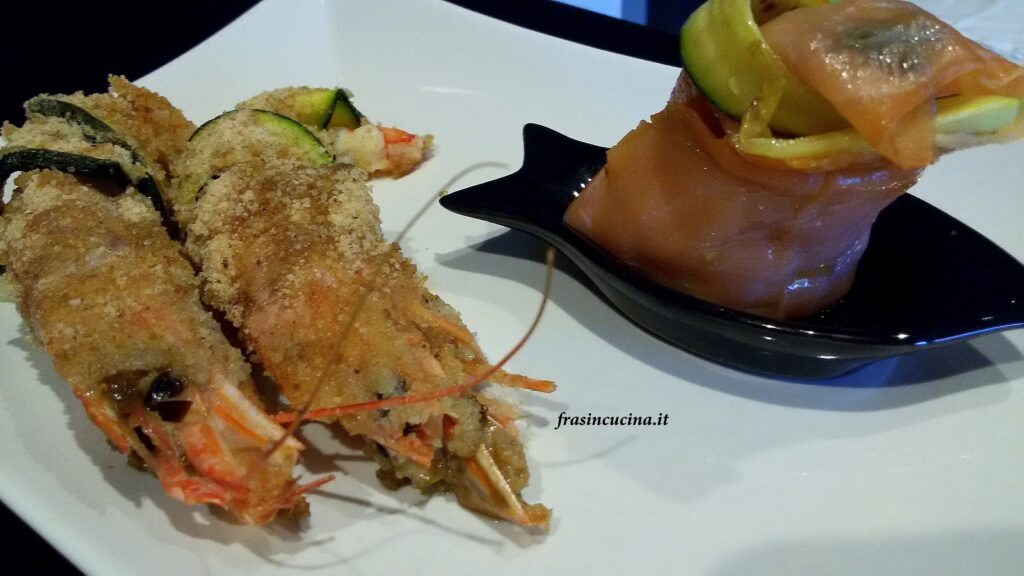 Gamberi gratinati e involtini di salmone